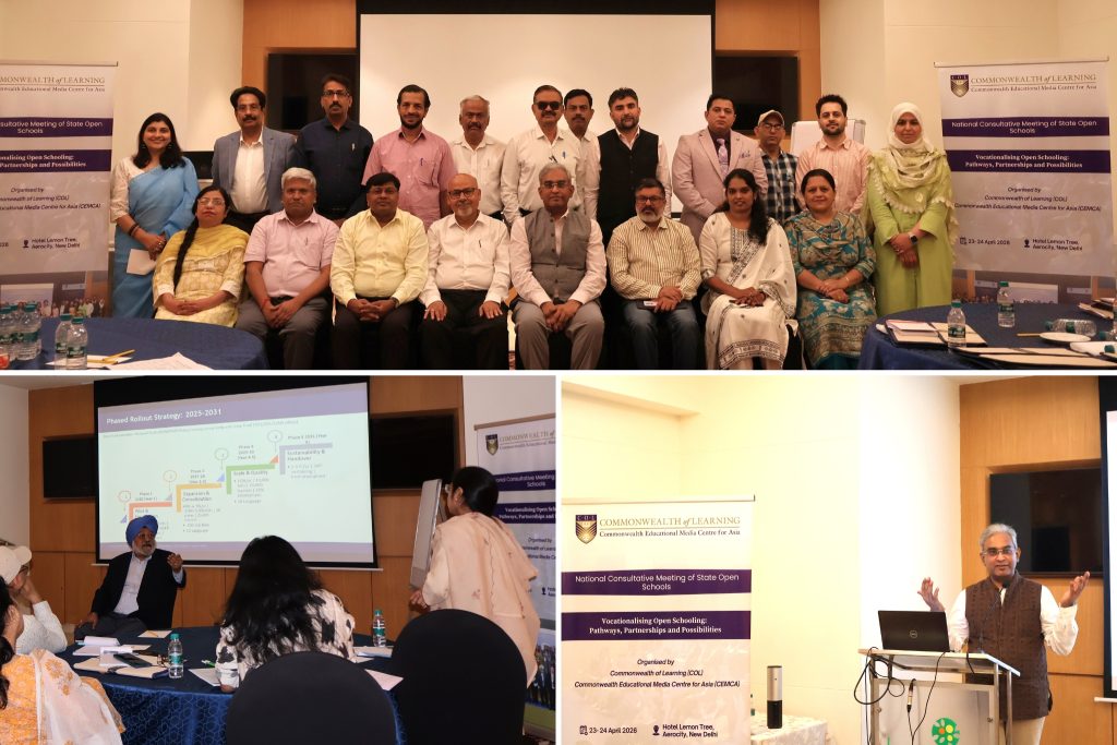 The Commonwealth of Learning’s Commonwealth Educational Media Centre for Asia (COL-CEMCA) hosted a two-day National Consultative Meeting of State Open Schools (SOS) on 23–24 April 2026 at Hotel Lemon Tree, Aerocity, New Delhi. Directors and senior representatives from State Open Schools across Bihar, Himachal Pradesh, Jammu & Kashmir, Karnataka, Kerala, Madhya Pradesh, Punjab, Rajasthan, Sikkim and Telangana participated, alongside experts from National Institute of Open Schooling (NIOS), National Council of Vocational Education and Training (NCVET), Textile Sector Skill Council (TSC), and the Directorate General of Training (DGT).