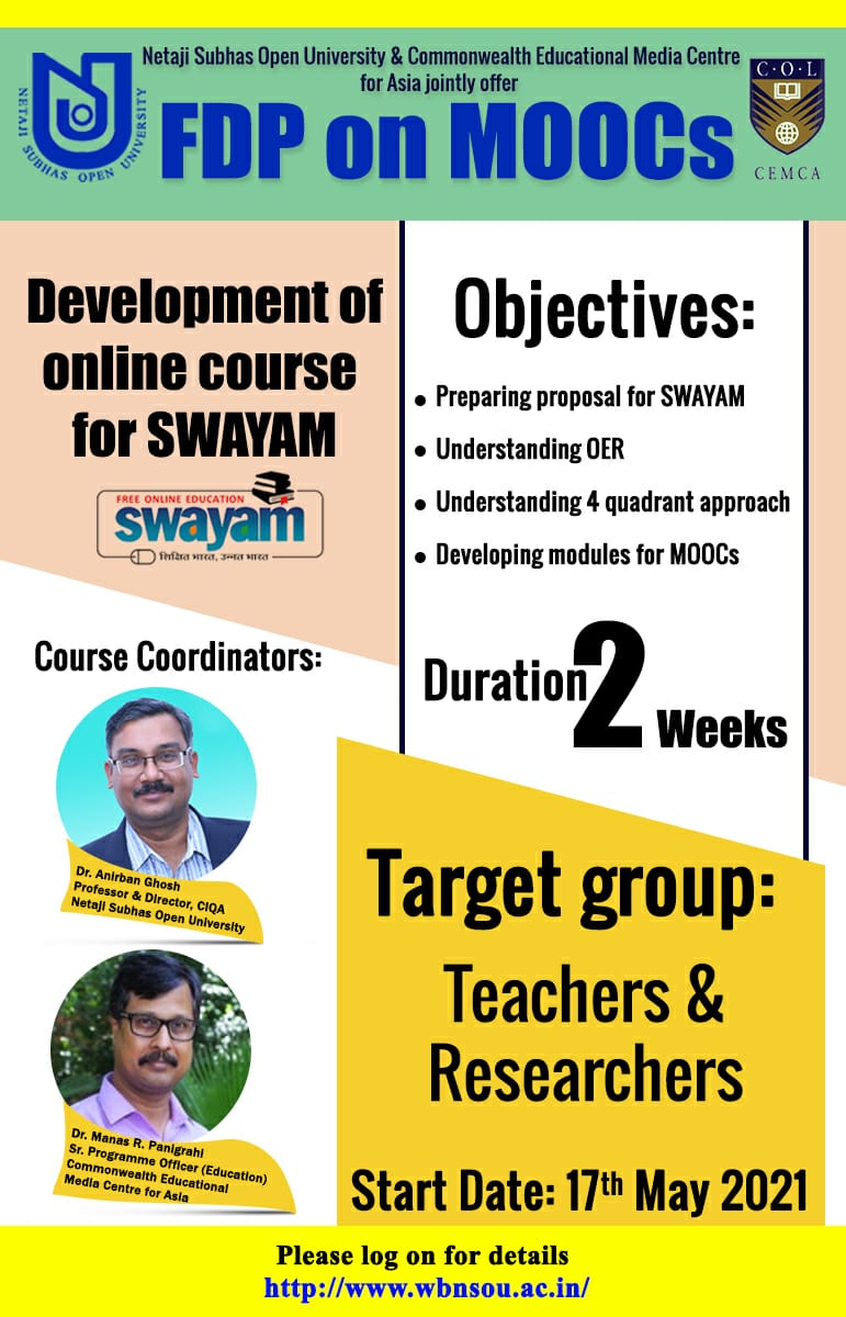 The MOOC is for Teachers of Higher Education with the objective that they will learn the SWAYAM framework for design of Online Courses for SWAYAM was developed by Commonwealth Educational Centre for Asia (CEMCA) with the highly experienced experts. The two-week course (19 May 2021 to 05 June 2021) was coordinated by Dr. Manas R. Panigrahi, CEMCA and Professor Anirban Ghosh, NSOU. 219 faculties registered their name on the LMS to pursue this online FDP. The participants interacted through Discussion Forum on various relevant topics on asynchronous mode. Two live sessions were also organized in the week-end evening to interact with the participants. Around 200 participants participated in the live sessions. All the course developers participated in the live interaction to clarify their doubts. At the end the course, there was a provision for assessment though it was not compulsory. 43% of the total participants submitted their assignments for certification. Certificates were issued to the successful participants who scored 60% in the assessment.