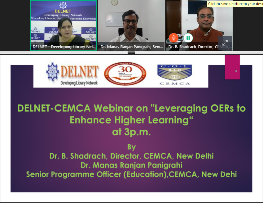 CEMCA in collaboration with DELNET, India organised a Webinar session on "Leveraging OERs to Enhance Higher Learning" on September 30, 2022. The Session was attended by 500 educational professionals and librarians across the globe. Dr Sangeeta Kaul, Director