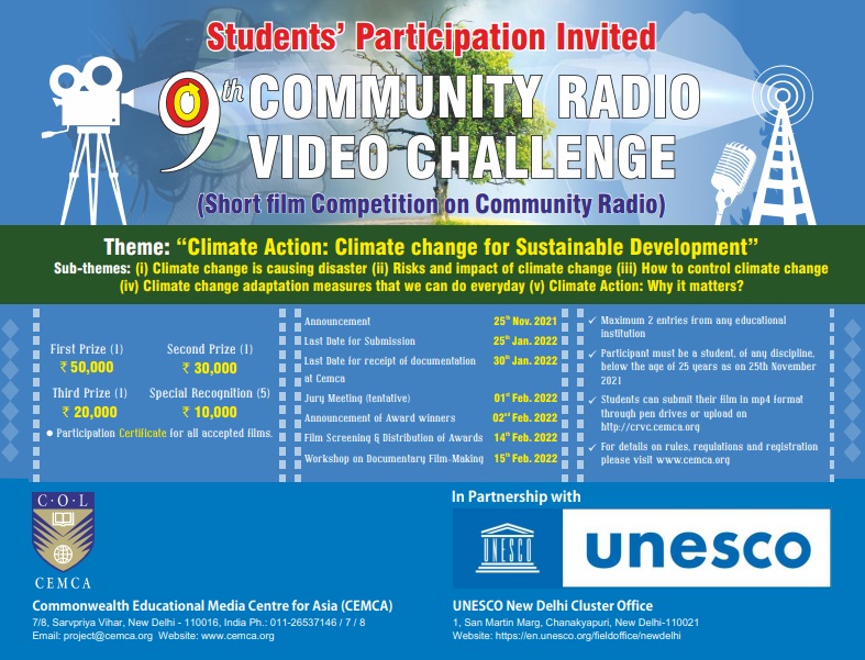 A joint initiative of Commonwealth Educational Media Centre for Asia (CEMCA) , UNESCO and Apeejay Institute of Mass Communication, the competition is open to students in universities, colleges and institutions pursuing a degree in Media, Communication and/or Journalism. The video can be from three to five minutes and the last date of online submission is January 25, 2022.