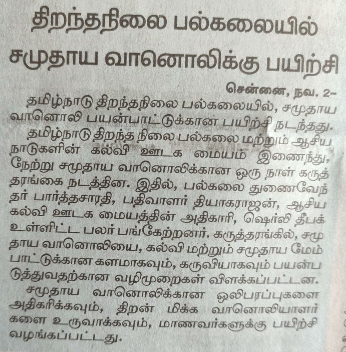 A one day capacity building workshop on using Community Radio as a tool of Community Development was organized by CEMCA in collaboration with Tamilnadu Open University, Chennai at TNOU, Chennai on 1 st November 2019.